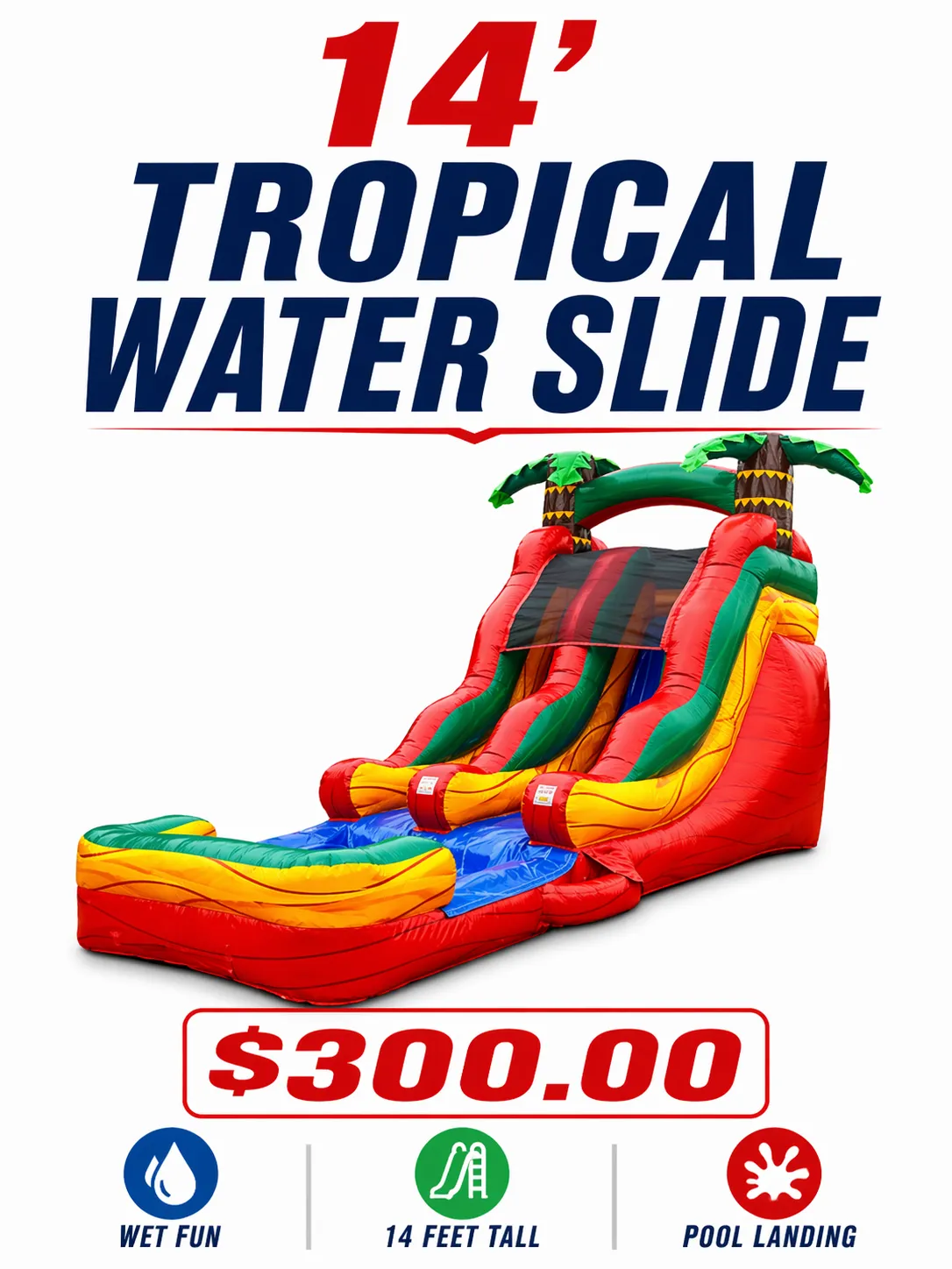 Make a splash with the 14' Tropical Water Slide, your backyard's ultimate summer attraction. Its vibrant tropical design and thrilling drop promise endless fun for all ages.